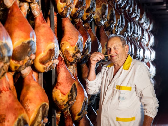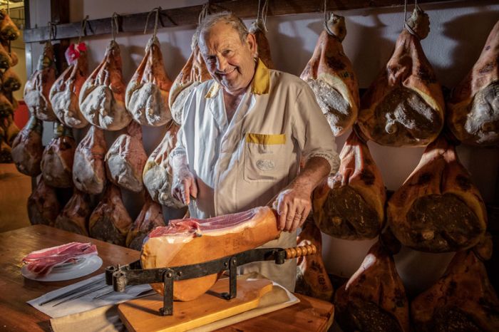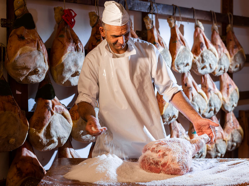 Servizio fotografico in azienda, foto prosciutto con ambientazione.