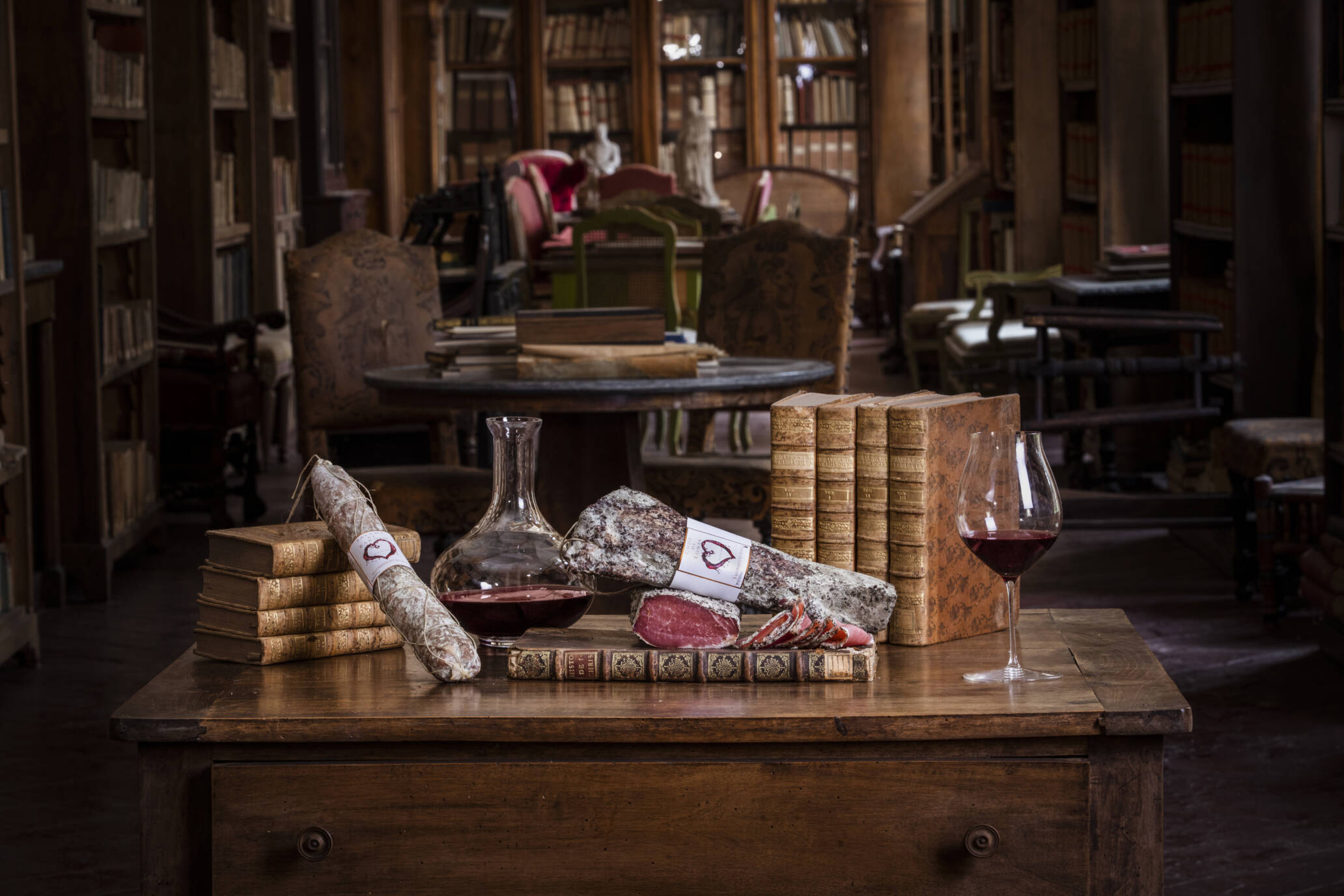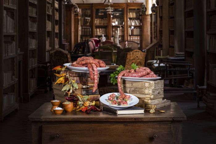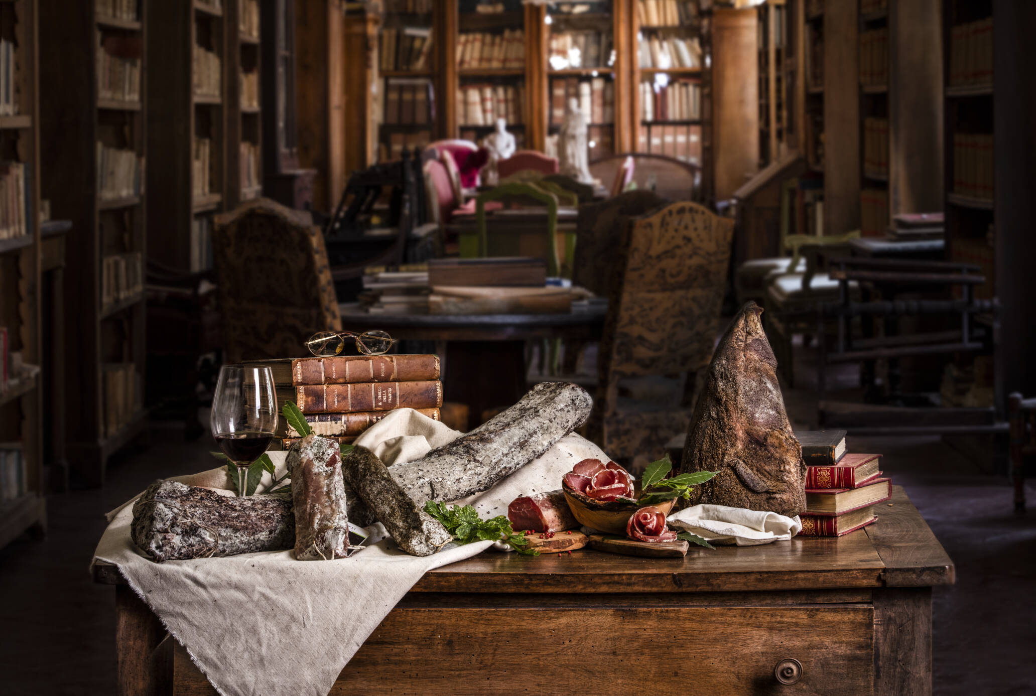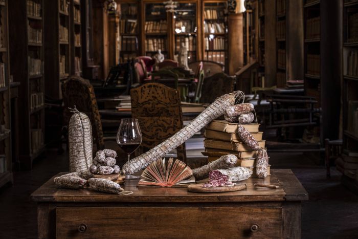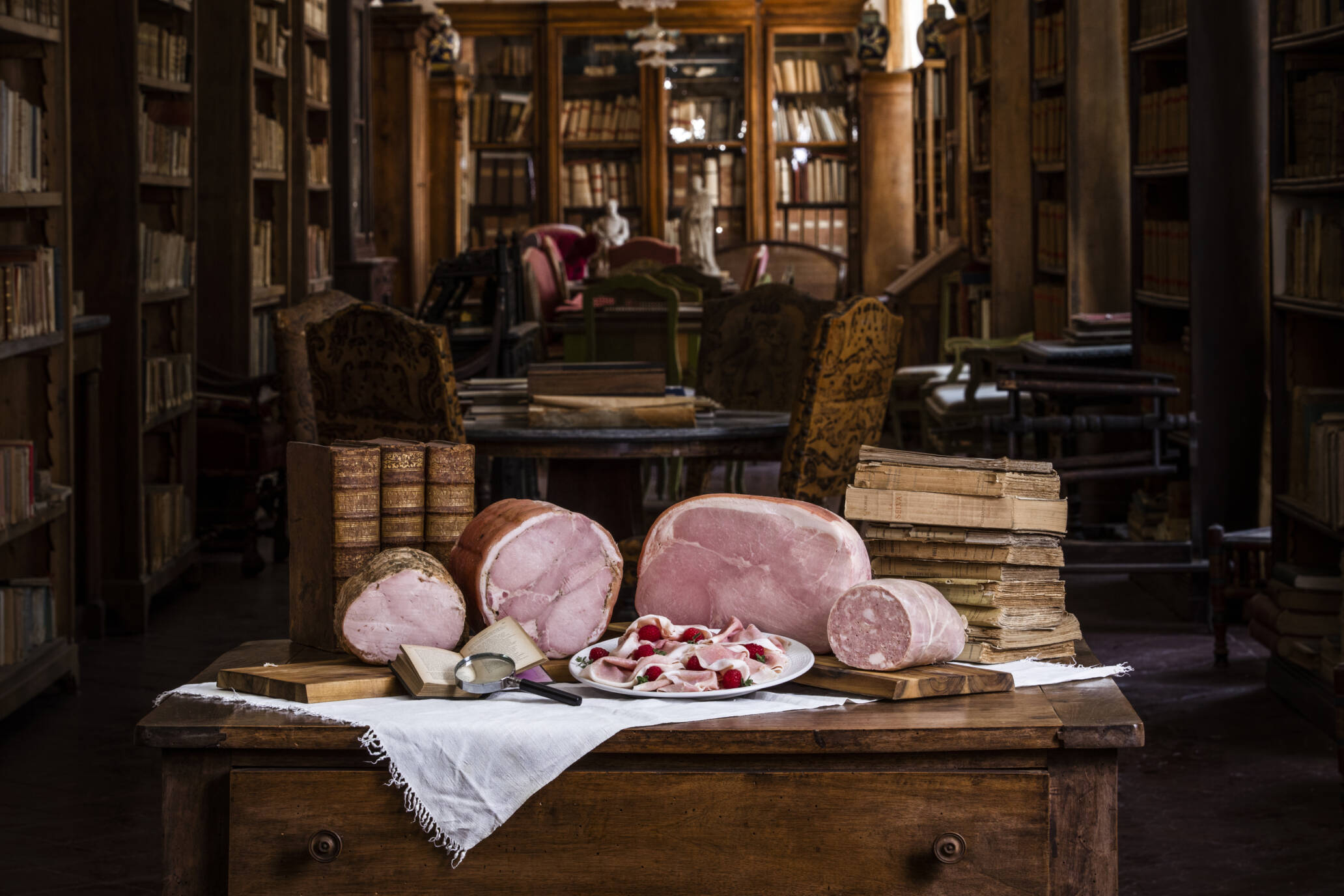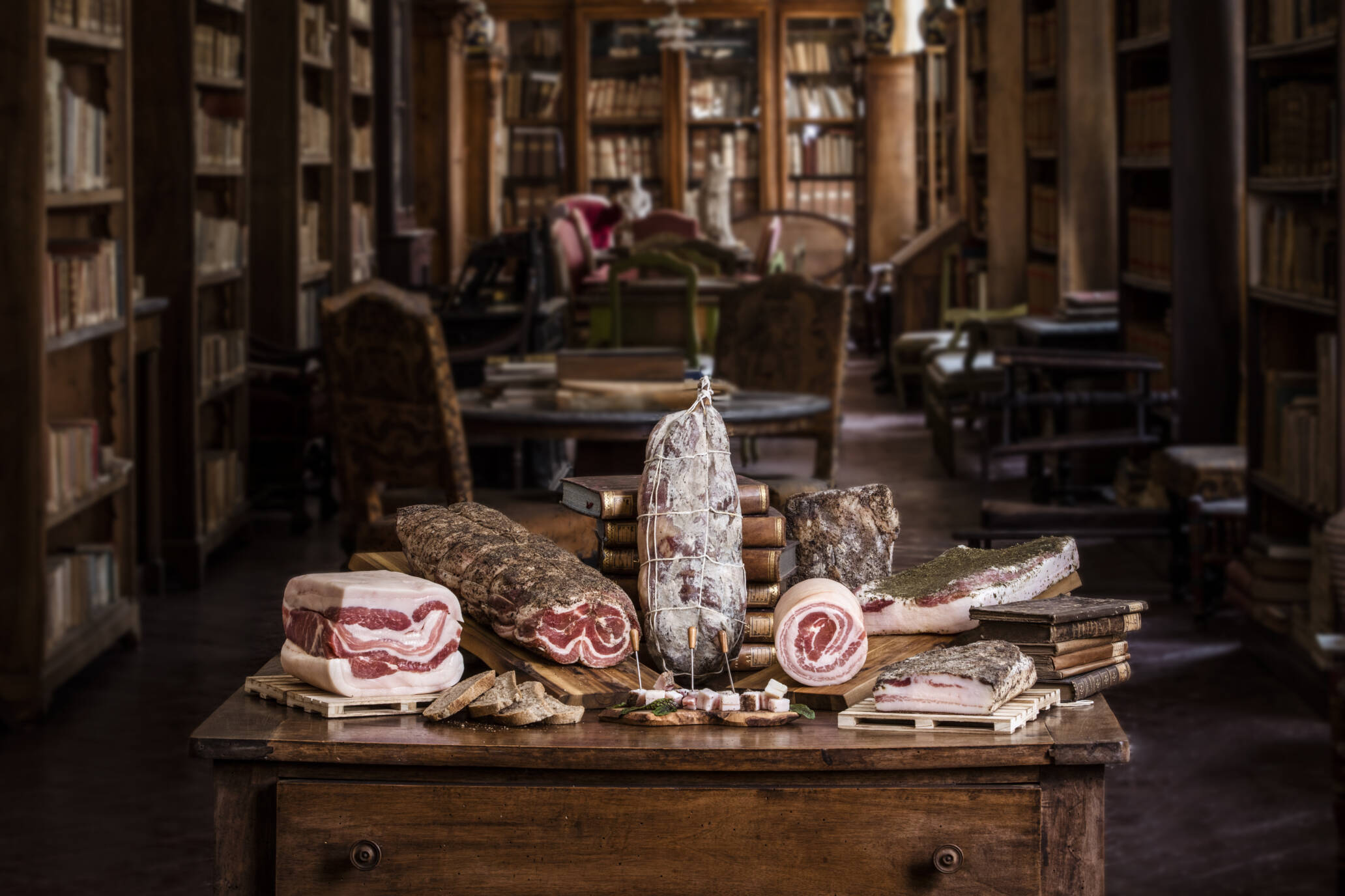 Shooting prodotti di salumeria, ambientati in un'antica biblioteca.
